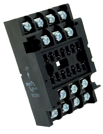 The V22BR is a surface / wall mount relay socket with extra space for ring tabs. The V22BR socket has one screw terminal per relay contact suitable for two wires up to 2.5 mm2 and 9 mm ring tabs, so looping/daisy chaining can be done on the socket and no external connector or terminal is needed.