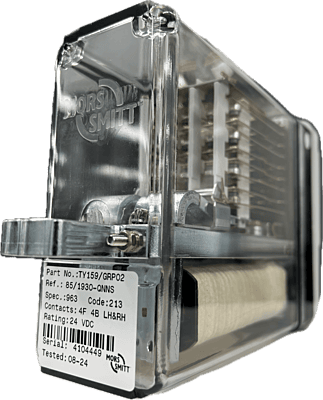 The TY159/GRP02 is a Twin 4F 4B slow operate, slow release neutral line relay for railway trackside signalling applications where AC immunity is not required. Twin relays consist of two relays which in effect are electrically and mechanically independent, housed in a single enclosure to the dimensions of a single relay to BR930. Of compact modular plug-in design, it has non-weld contacts and is equipped with a safety interlocking system (pin code) for insertion into mating plugboards.