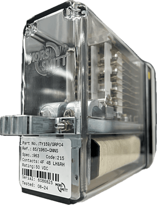 The TY159/GRP04 is a Twin 4F 4B slow operate, slow release neutral line relay for railway trackside signalling applications where AC immunity is not required. Twin relays consist of two relays which in effect are electrically and mechanically independent, housed in a single enclosure to the dimensions of a single relay to BR930. Of compact modular plug-in design, it has non-weld contacts and is equipped with a safety interlocking system (pin code) for insertion into mating plugboards.