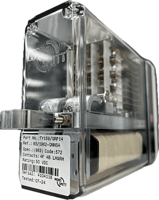 The TY159/GRP14 is a Twin AC immune 4F 4B slow operate, slow release neutral line relay for railway trackside signalling applications. Twin relays consist of two relays which in effect are electrically and mechanically independent, housed in a single enclosure to the dimensions of a single relay to BR930. Of compact modular plug-in design, it has non-weld contacts and is equipped with a safety interlocking system (pin code) for insertion into mating plugboards.