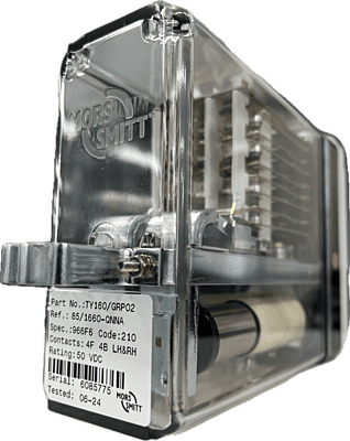 The TY160/GRP02 is a Twin 4F 4B AC Immune DC neutral line relay for general railway trackside signalling applications where special characteristics such as slow release etc. are not required. Twin relays consist of two relays which in effect are electrically and mechanically independent, housed in a single enclosure to the dimensions of a single relay to BR930. Of compact modular plug-in design, it has non-weld contacts and is equipped with a safety interlocking system (pin code) for insertion into mating plugboards.