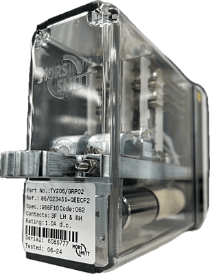 The TY206/GRP01 is a Twin 2F DC Neutral relay suitable for lamp proving of flashing DC lamps. Such application is required for flashing road signals at level crossing installations. The circuit for each half of the twin relay consists of one pair of Unipart Dorman LWWM2/R/2/50/01 energised from a battery supply. Each lamp of the pair will flash alternately, with a space or an overlap of up to 0.045 seconds, at a rate of 60 to 90 flashes per minute per lamp.